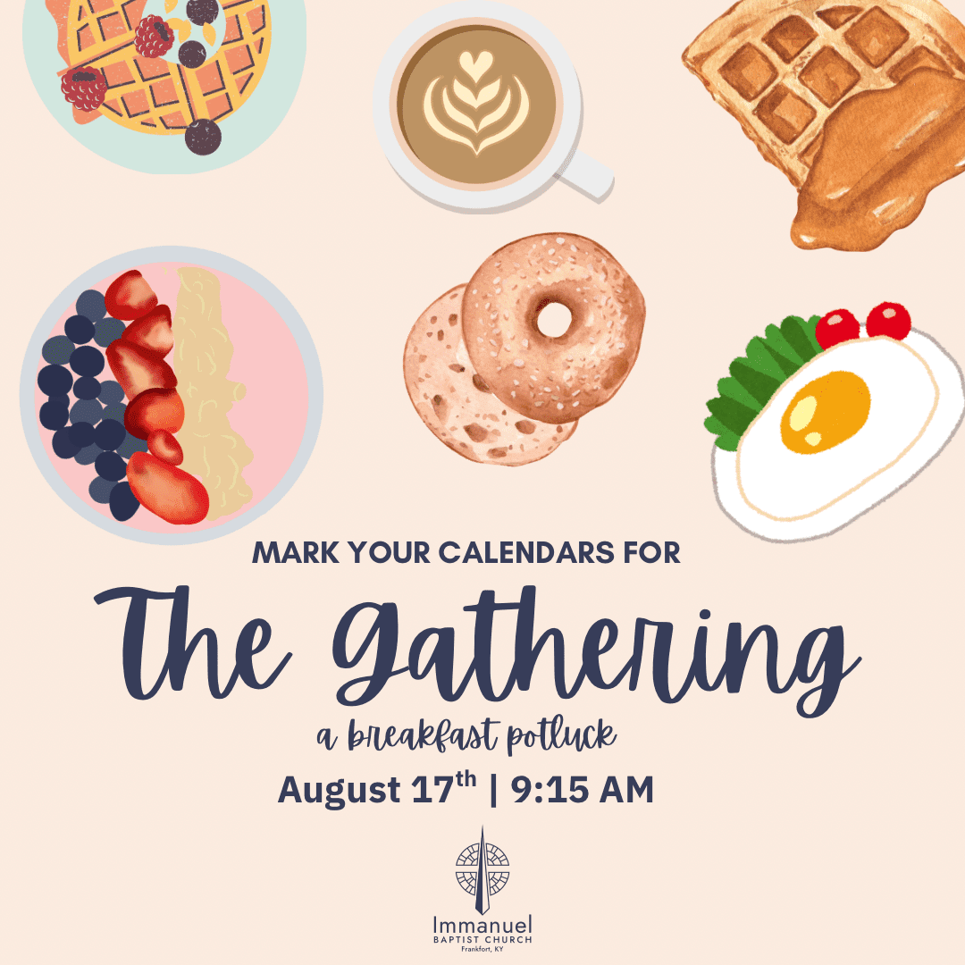 Join us in the Fellowship Hall at 9:15 a.m., on Sunday, August 17, for our quarterly Gathering breakfast potluck. Bring your favorite breakfast dish (or a box of donuts), and come enjoy some food and fellowship with your Immanuel family.