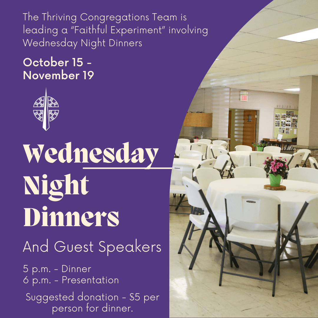 Beginning on October 15, we will begin having Wednesday Night Dinners and programming as Part II of our Thriving Congregations experiment. We will be learning more about the unhoused community in Frankfort and hearing from people throughout the city and county who work with those who are living without homes in our community.