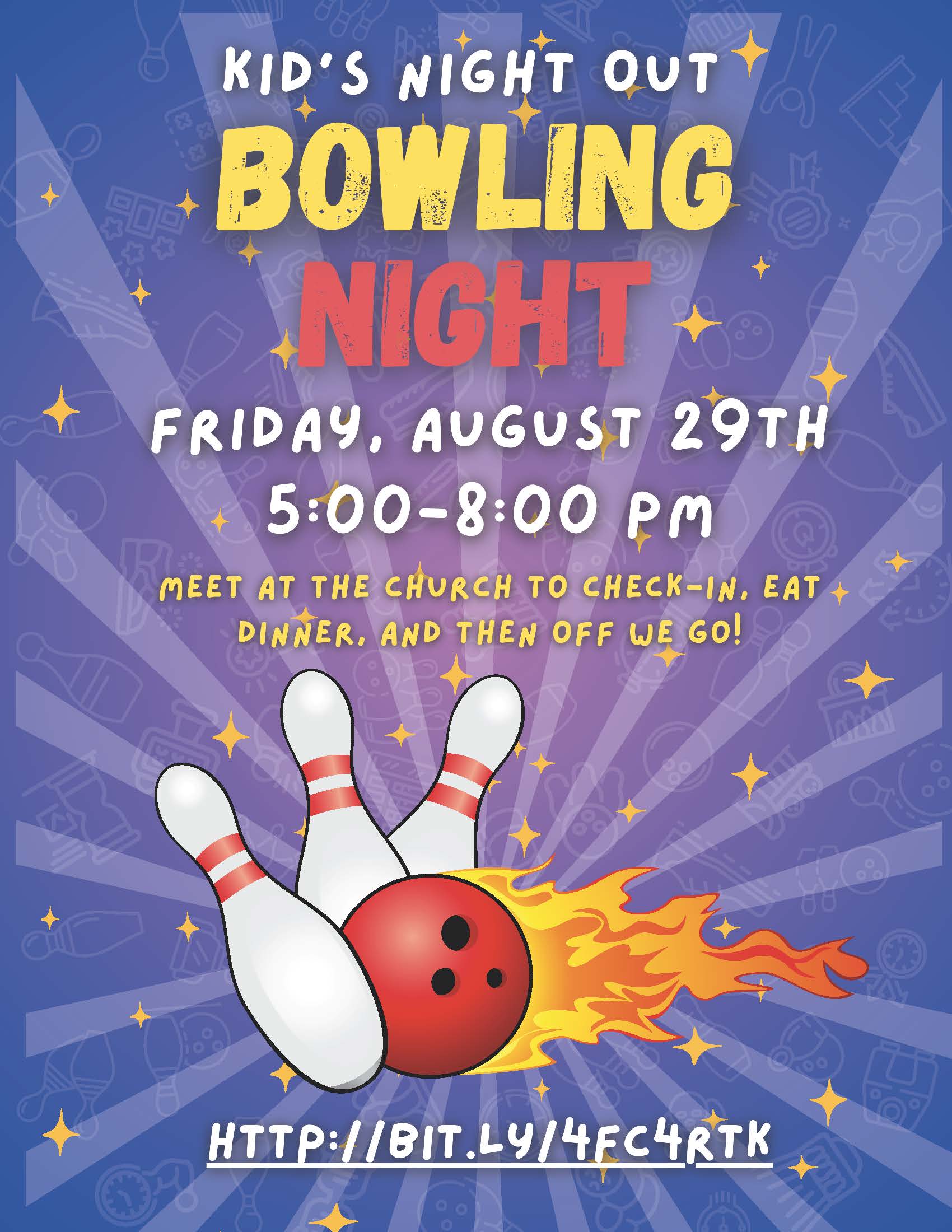 Join us for our final Kid's Night Out of the year! Kids are invited to meet at the church at 5 p.m., for check-in and dinner. Following dinner, they will ride the church bus to Capital Bowl for a fun night of bowling excitement. Click here to register today! |